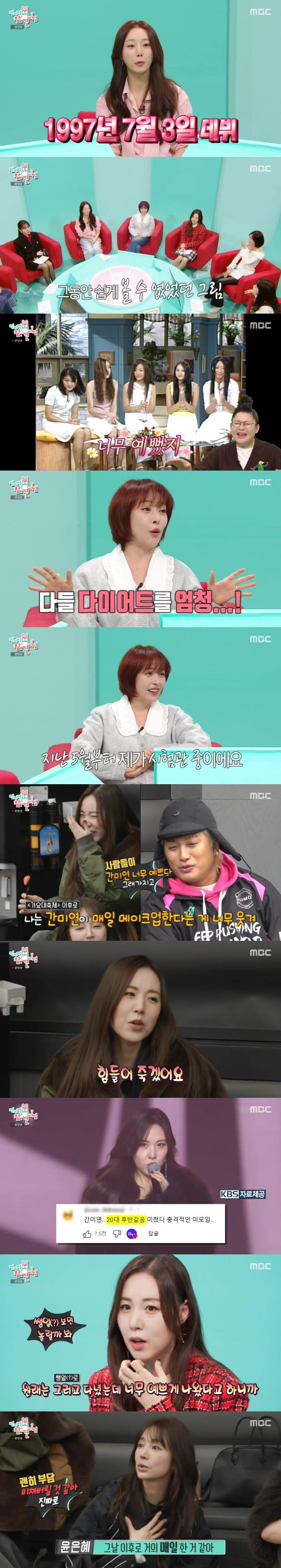 심은진은 "당시에는 퍼포먼스 뮤직비디오라는 게 없었다"고 했고, 윤은혜는 "따라가기 힘든 게 많더라"며 웃었다. 이어 심은진은 "멤버들이 오랜만에 뭉친다고 다이어트를 엄청 열심히 했다"면서 "저는 지난 5월부터 시험관 중이다. 제가 조금 아쉽긴 했지만 어쩔 수 없는 거니까"라고 했다. 이에 김이지는 "부어도 미모가 이 정도"라며 심은진의 미모를 칭찬했다.