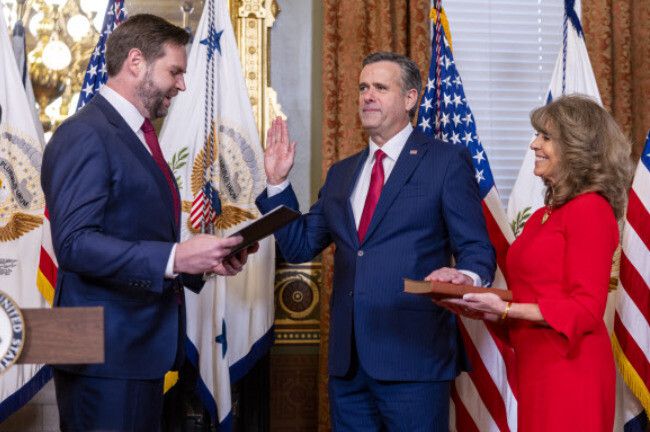 존 랫클리프 미국 신임 중앙정보국장이 23일 상원에서 인준을 받은 뒤 상원의장인 제이디 밴스 부통령에게 취임 선서를 부인 미셸 랫클리프가 지켜보는 가운데 하고 있다. UPI 연합뉴스 |