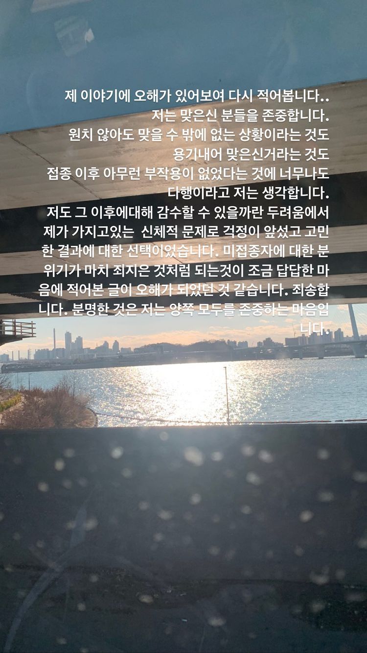 그는 "저는 (백신을) 맞으신 분들을 존중합니다. 원치 않아도 맞으실 수 밖에 없는 상황이라는 것도, 용기내어 맞으신거라는 것도, 접종 이후 아무런 부작용이 없었다는 것에 너무너무 다행이라고 저는 생각한다"고 전했다.