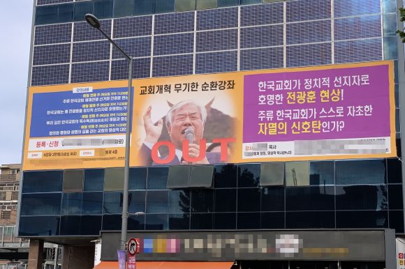 B 목사는 2022년 9월 한 강좌를 홍보하는 대형 현수막을 게시하면서 현수막 중앙에 전광훈 목사가 연설하는 얼굴 사진과 그 아래에 ‘OUT’이라는 붉은색 문구를 넣었다.