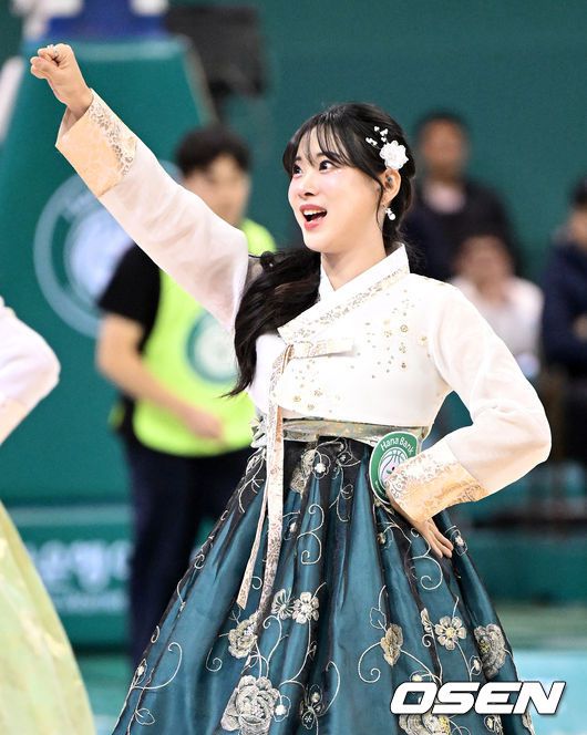 [OSEN=부천, 지형준 기자] 3일 오후 부천실내체육관에서 하나은행 2024-2025 여자프로농구 정규리그 하나은행과 우리은행의 경기가 열렸다. 우리은행은 15승 7패로 1위 BNK 썸에 0.5게임 차 2위, 5연패 중인 하나은행은 5승 16패 최하위를 기록중이다. 하나은행 김한나 치어리더가 한복을 입고 공연을 선보이고 있다. 2025.01.27/ jpnews@osen.co.kr 이 기사의 카테고리는 언론사의 분류를 따릅니다.0공유하기