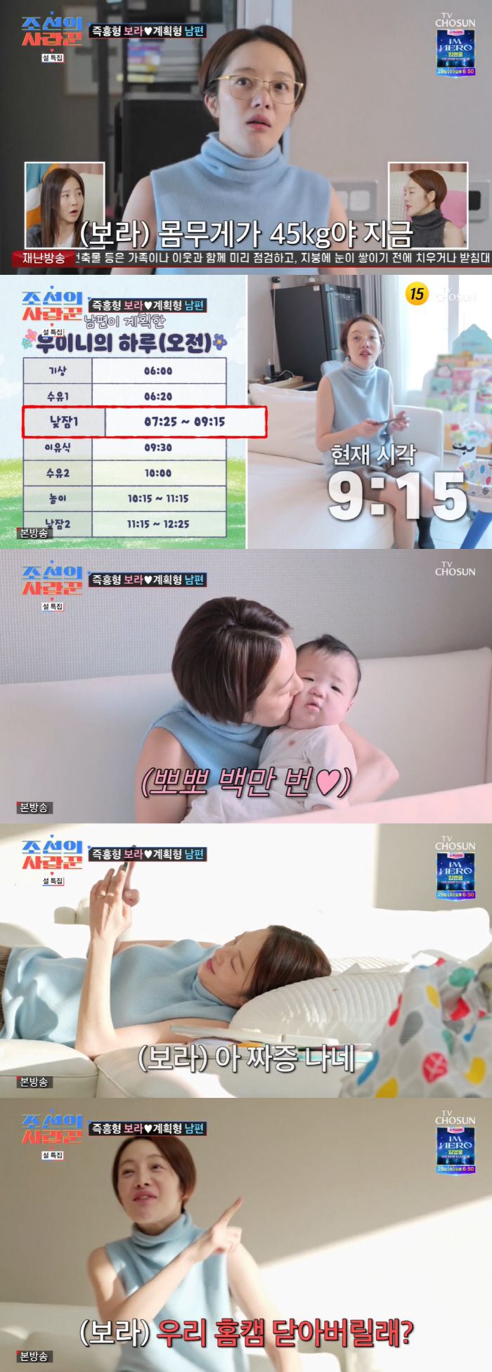 황보라는 생후 200일 된 아들 우인이를 육아하느라 몸무게가 45kg까지 빠졌다고 이야기했다. 이어 수유, 낮잠, 이유식 주는 시간이 빼곡히 적힌, 남편이 작성한 하루 육아 계획표를 공개했다. 남편은 지독한 계획형이고 황보라는 즉흥형이라고. 남편은 일주일치 이유식도 종류별로 만들어 미리 얼려놨다. 황보라는 아침 식사도 못하고 육아에 매진했고 이내 지친 모습을 보였다.