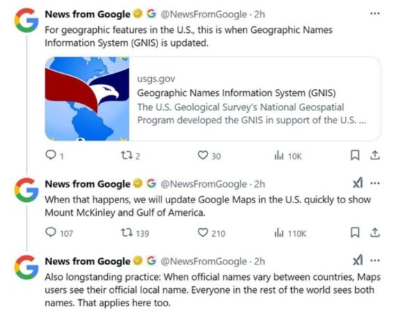 구글은 27일(현지시간) 자사 뉴스를 알리는 엑스 계정에 "구글 맵 내의 지명에 관한 여러 질문을 받았다"며 "우리는 정부 공식 자료에 업데이트될 때 지명 변경을 적용하는 오랜 관행을 갖고 있다"고 밝혔다. 그러면서 미국 지명정보시스템(GNIS)이 업데이트되면 즉시 미국 내 구글 맵에 '미국만'과 '매킨리산'을 표기할 예정이라고 설명했다.