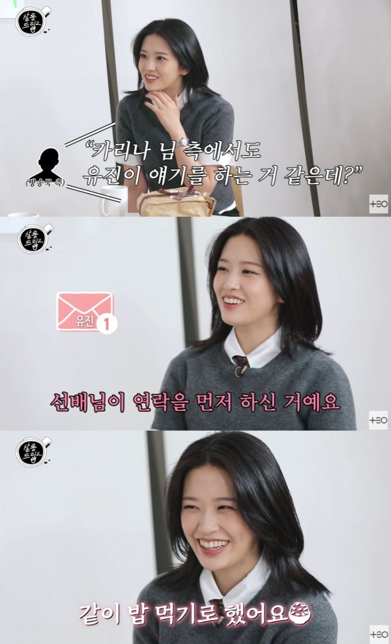 또 안유진은 "언니가 또 항상 연습 끝나면 '고생했다'고 카톡을 해줬다"며 고마워하기도 했다. 이어 최근 “SNS에 사진 올려도 되냐고 많이 물어본다”고 말하며 카리나와 친분을 드러냈다.