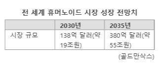 이같은 기술력을 쌓아 양사 모두 인간을 닮은 '휴머노이드' 로봇을 개발하는 것을 목표로 하고 있다. 글로벌 투자은행 골드만삭스 보고서에 따르면 전 세계 휴머노이드 시장 규모는 2030년 138억 달러(약 19조원), 2035년엔 380억 달러(약 55조원) 규모로 성장이 예상된다.