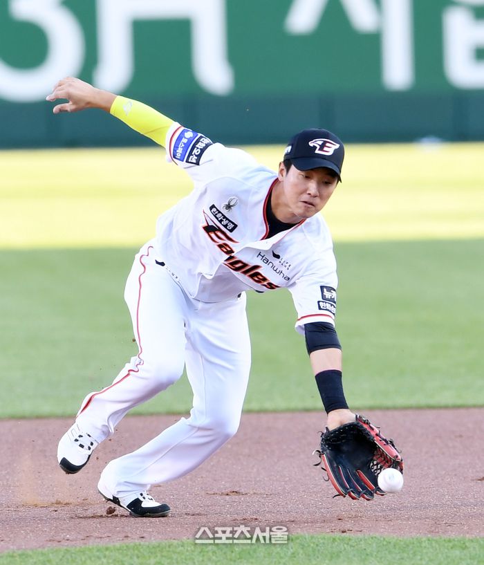 3회 1사 1,2루 상황에서 상대 문성주의 타구를 몸을 날려 처리한 후 1루주자 홍창기를 태그아웃 시켰다.