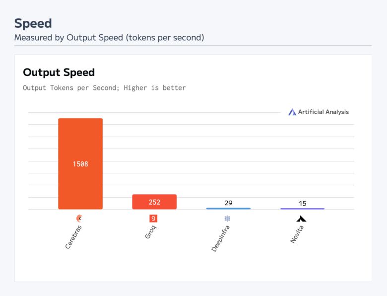 이 회사의 웨이퍼-스케일 칩을 탑재한 '세레브라스 추론(Cerebras Inference)' 플랫폼을 통해 모델을 실행한 결과, 초당 1796토큰의 출력 속도를 기록했다고 밝혔다.