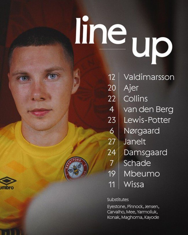 브렌트포드는 위사, 음뵈모, 샤데, 담스가르드, 야넬트, 뇌르가르드, 루이스-포터, 반 덴 베르, 콜린스, 아예르, 발디마르손이 출격한다. 김지수는 명단에서 제외됐다.