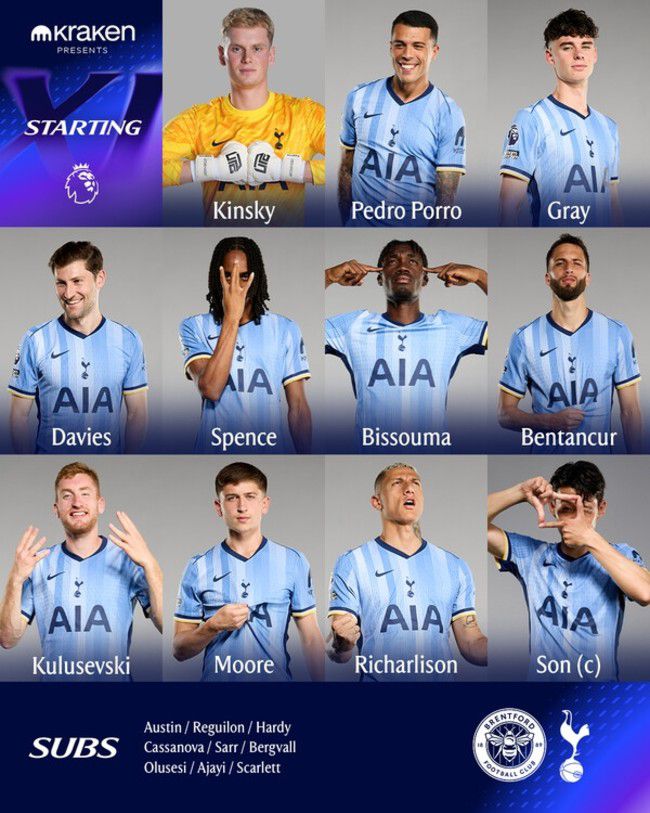 [인터풋볼] 주대은 기자 = 토트넘 홋스퍼와 브렌트포드가 경기를 앞두고 선발 명단을 공개했다. 손흥민이 출격한다.