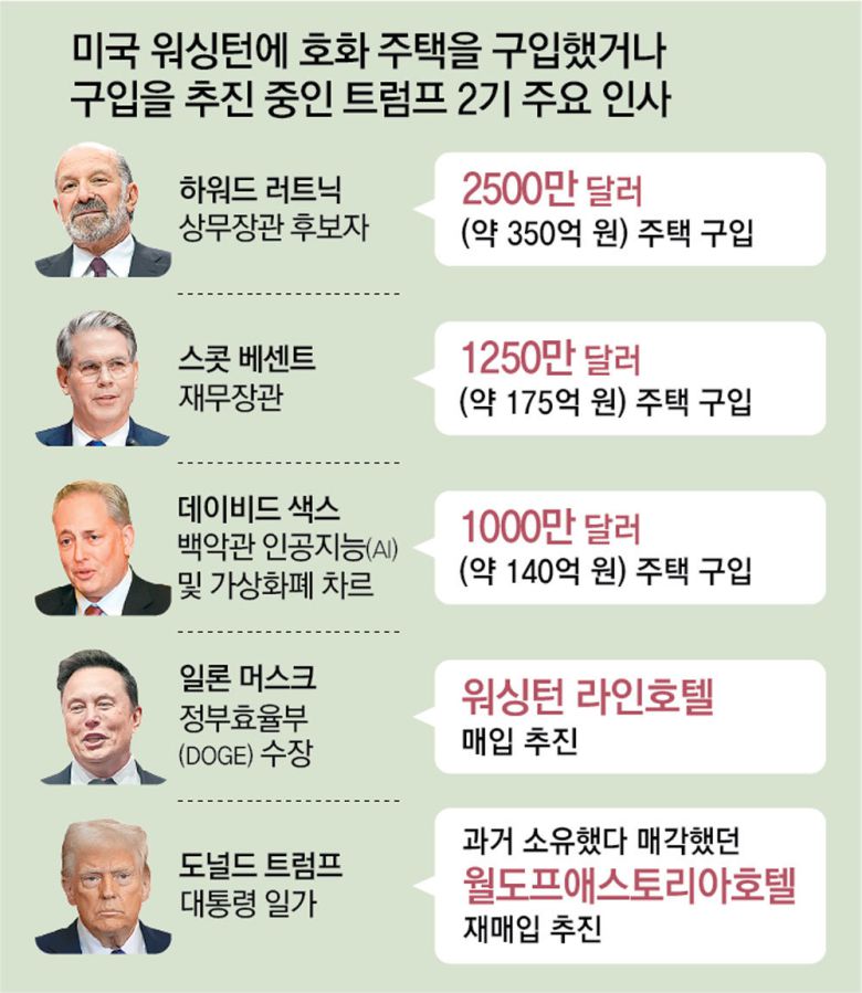 억만장자 기업가 출신이 대거 포진한 도널드 트럼프 2기 미국 행정부의 주요 인사가 워싱턴 일대의 고급 주택을 대거 매입하고 있다고 월스트리트저널(WSJ)이 1일 보도했다. 특히 트럼프 대통령의 지난해 대선 승리 직후인 같은 해 11, 12월에만 500만 달러(약 70억 원) 이상의 호화주택 거래가 20건을 기록했다. 2023년 같은 시기(10건)보다 두 배로 늘었다.