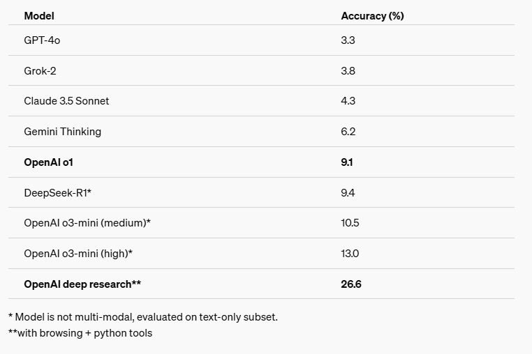 오픈AI가 복잡한 작업을 위해 인터넷에서 다단계 심층 연구를 수행하는 새로운 인공지능(AI) 에이전트 '딥 리서치(Deep Research)'를 출시했다. 특히 벤치마크 사상 가장 어렵다는 '인류의 마지막 시험(Humanity's Last Exam)' 테스트에서 26.6% 정답을 기록, '딥시크-R1'의 9.4%를 2.8배나 앞섰다.