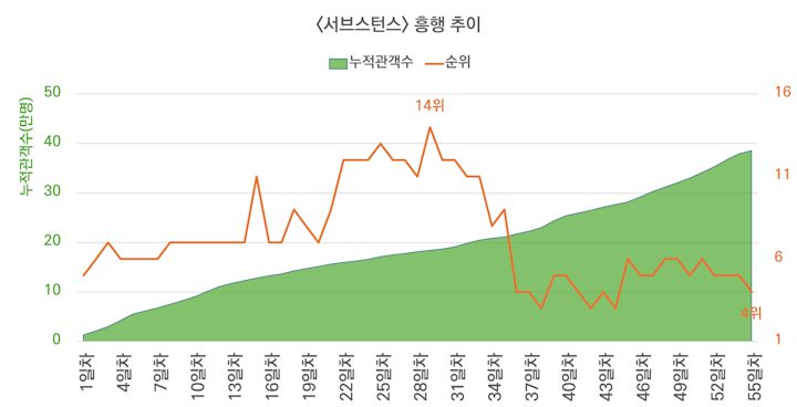 개봉 55일차인 3일에는 다시 4위로 뛰어올랐다. 특히 이날 좌석 점유율은 2.7%에 불과했지만, 좌석판매율은 11.5%를 기록하며 흥행의 열기를 이어가고 있다.