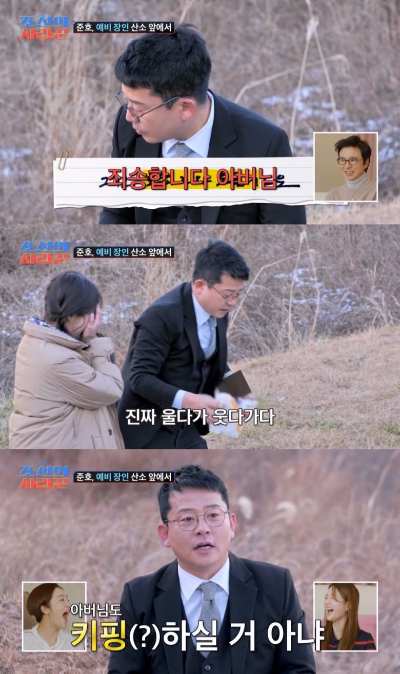이후 김지민은 과거 선후배 시절, 앞장서서 아버지의 운구를 도와준 '선배 김준호'의 사진을 공개했다. 김지민은 "이걸 보면서 가족들끼리 또 눈물을 흘렸다. 이게 이렇게 연이 되는구나. 운명인가 했다"고 담담하게 밝혔다. 그러자 김준호는 "아버지가 윤허해 주신 것 아니냐"는 농담으로 분위기를 끌어올렸다.