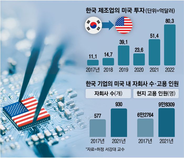 한국 제조업의 대미 투자 규모는 2020년 23억6000만달러에서 2022년 80억3000만달러로 크게 늘었다. 2017년 7.2%에 불과했던 대미 투자 내 제조업 비중도 2022년 28.9%로 급등했다.