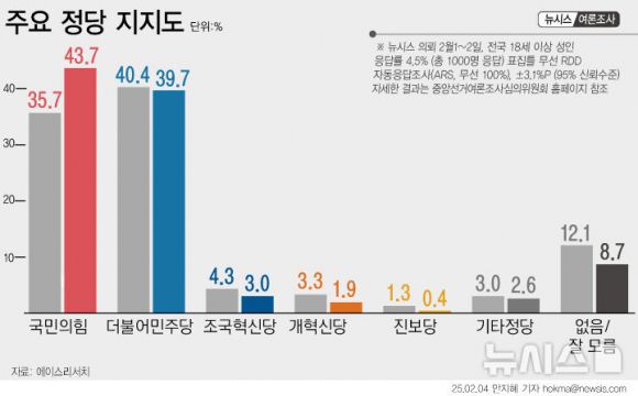 정당 지지도 조사에선 국민의힘이 더불어민주당을 오차범위 내에서 앞섰다는 결과가 나왔다. 국민의힘 지지율은 43.7%, 민주당 지지율은 39.7%로 나타났다.