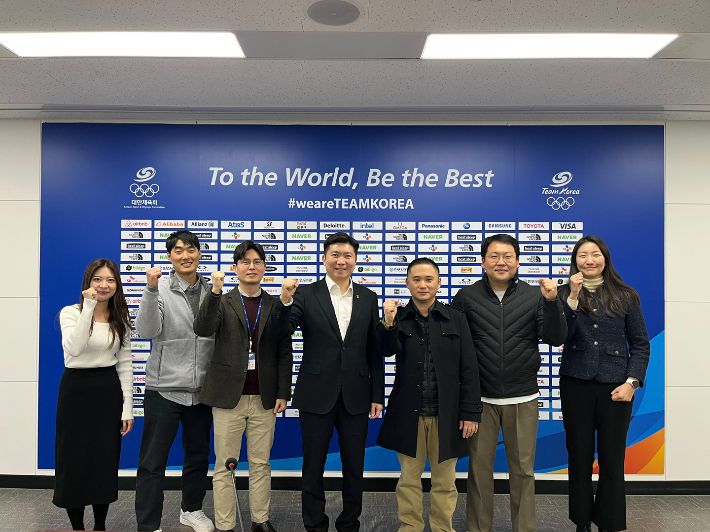 대한체육회 유승민 회장 당선인(가운데)이 4일 체육회 노조와 면담 뒤 기념 촬영을 한 모습. 체육회 노조 |