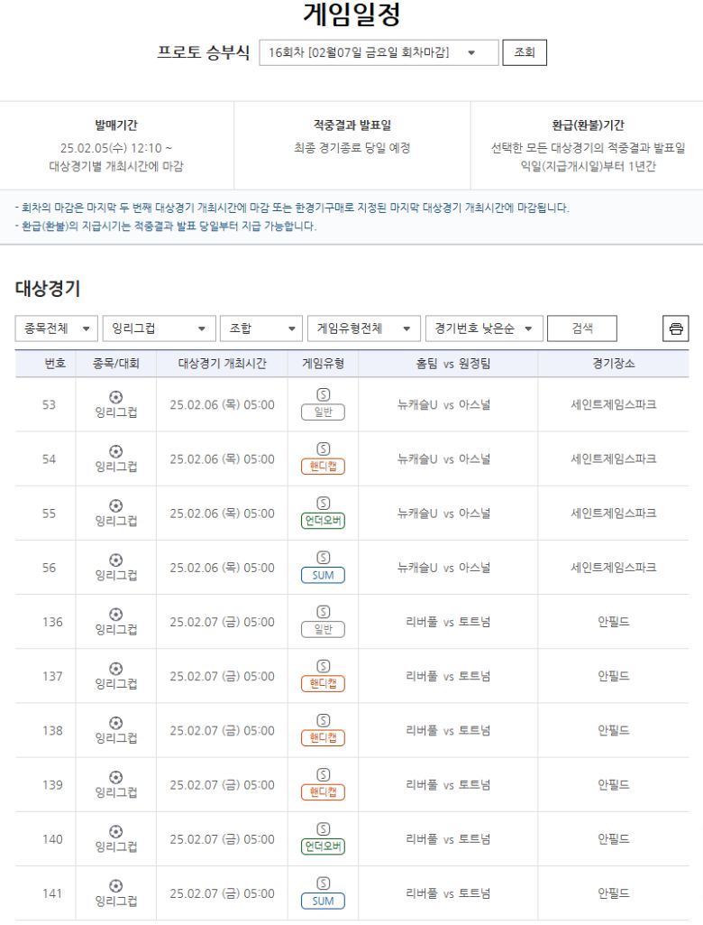 이번 회차에는 6일 오전 5시(한국 시간)에 세인트 제임스 파크에서 열리는 뉴캐슬-아스널(53~56번)전과 7일 오전 5시 안필드에서 진행되는 토트넘-리버풀(136~141번)전이 포함됐다. 위 게임은 승·무·패를 맞히는 일반 게임 이외에도 각 기준 값이 주어지는 핸디캡과 득점의 합이 기준 값보다 높은지, 낮은지를 예상하는 언더오버, 양 팀 최종 득점의 합을 기준으로 홀과 짝을 선택하는 SUM 등의 다양한 유형으로 즐길 수 있으며, 뉴캐슬-아스널전은 5일, 토트넘-리버풀전은 6일 각각 오후 10시까지 구매가 가능하다.