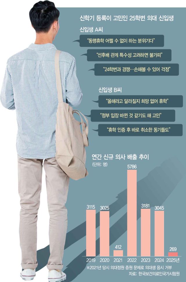 올해 서울 상위권 의대 ‘25학번’ 신입생 A(19) 씨. 대학 생활을 시작도 하기 전에 휴학을 해야 할지 말아야 할지 고민하고 있다. 꼼짝도 하지 않는 의료계와 정부의 갈등 때문이다. A 씨는 “입학 동기들 중에는 일단 휴학을 신청한 후에 단톡방에 인증한 다음 휴학을 취소한 경우도 있다고 들었다”며 “그동안 열심히 공부한 보상을 받아야 할 대학 생활을 시작도 하기 전에 걱정부터 앞선다”고 분위기를 전했다.
