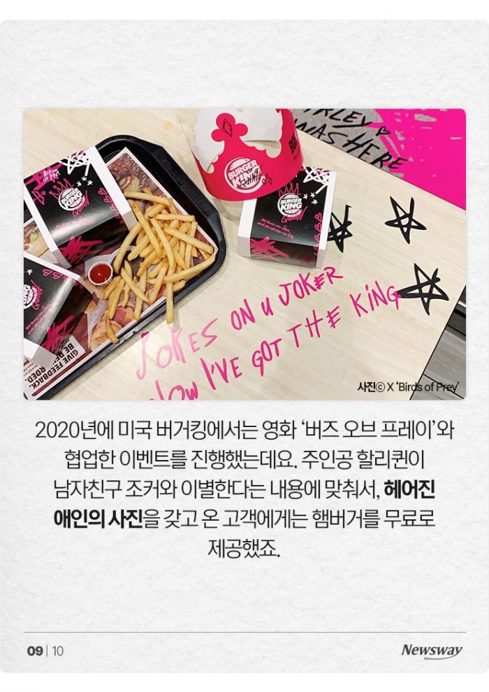 2020년에 미국 버거킹에서는 영화 '버즈 오브 프레이'와 협업한 이벤트를 진행했는데요. 주인공 할리퀸이 남자친구 조커와 이별한다는 내용에 맞춰서, 헤어진 애인의 사진을 갖고 온 고객에게는 햄버거를 무료로 제공했죠.
