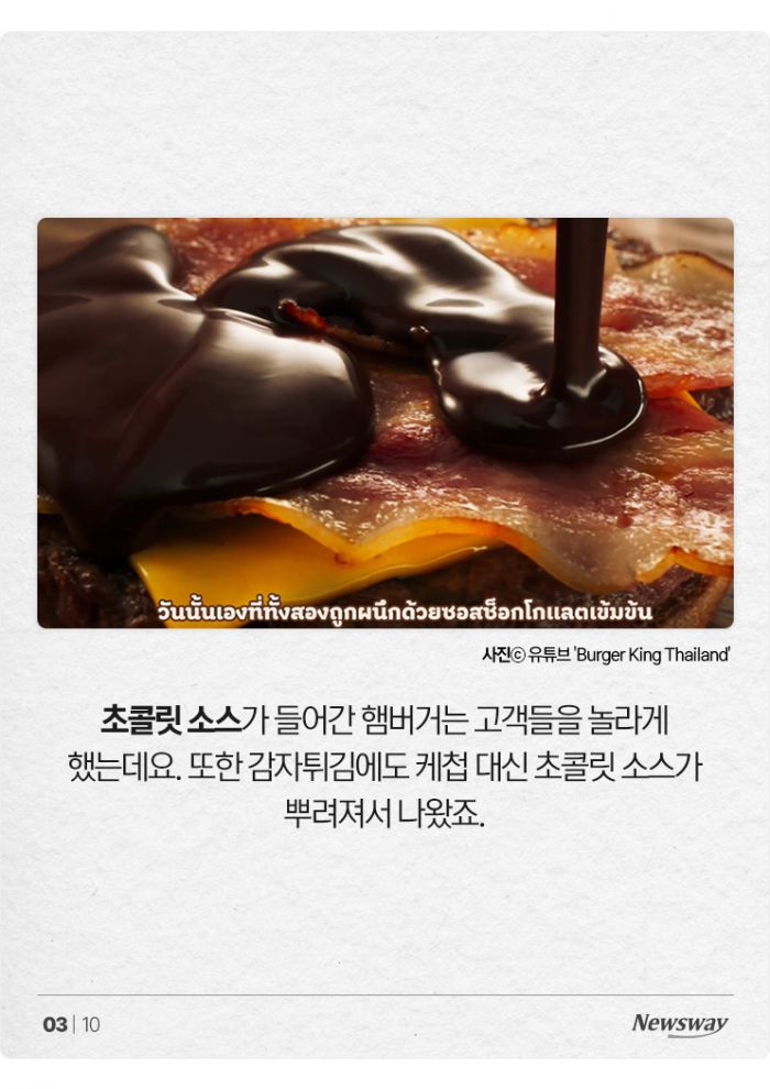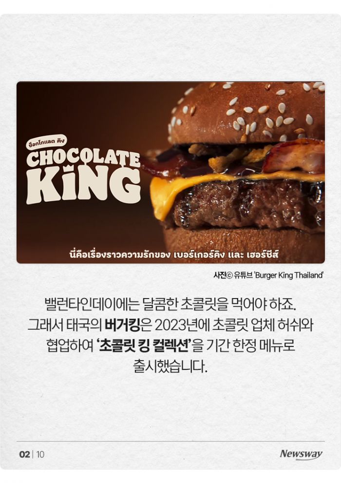 밸런타인데이에는 달콤한 초콜릿을 먹어야 하죠. 그래서 태국의 버거킹은 2023년에 초콜릿 업체 허쉬와 협업하여 '초콜릿 킹 컬렉션'을 기간 한정 메뉴로 출시했습니다.
