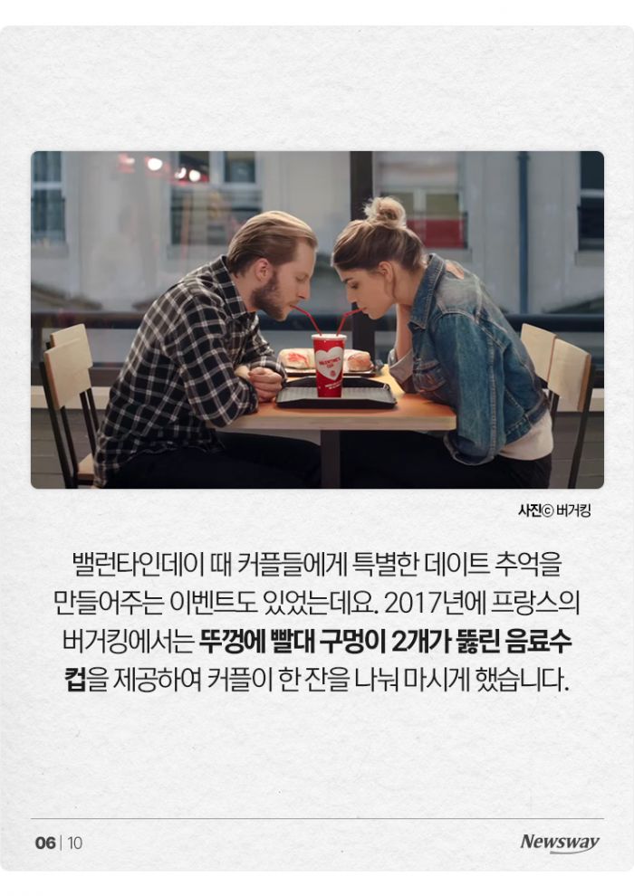 밸런타인데이 때 커플들에게 특별한 데이트 추억을 만들어주는 이벤트도 있었는데요. 2017년에 프랑스의 버거킹에서는 뚜껑에 빨대 구멍이 2개가 뚫린 음료수 컵을 제공하여 커플이 한 잔을 나눠 마시게 했습니다.