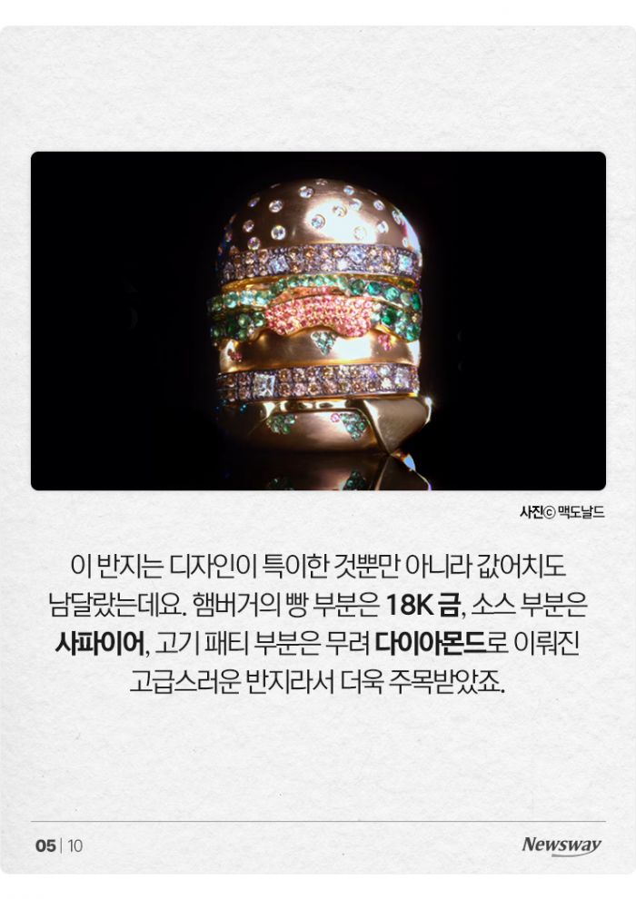 이 반지는 디자인이 특이한 것뿐만 아니라 값어치도 남달랐는데요. 햄버거의 빵 부분은 18K 금, 소스 부분은 사파이어, 고기 패티 부분은 무려 다이아몬드로 이뤄진 고급스러운 반지라서 더욱 주목받았죠.