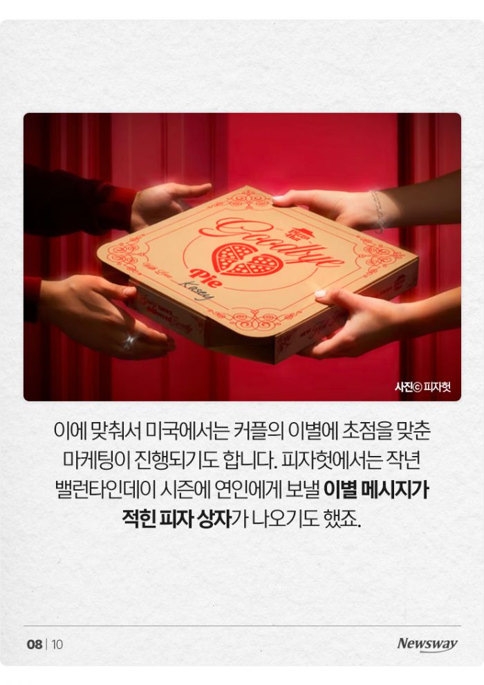 이에 맞춰서 미국에서는 커플의 이별에 초점을 맞춘 마케팅이 진행되기도 합니다. 피자헛에서는 작년 밸런타인데이 시즌에 연인에게 보낼 이별 메시지가 적힌 피자 상자가 나오기도 했죠.