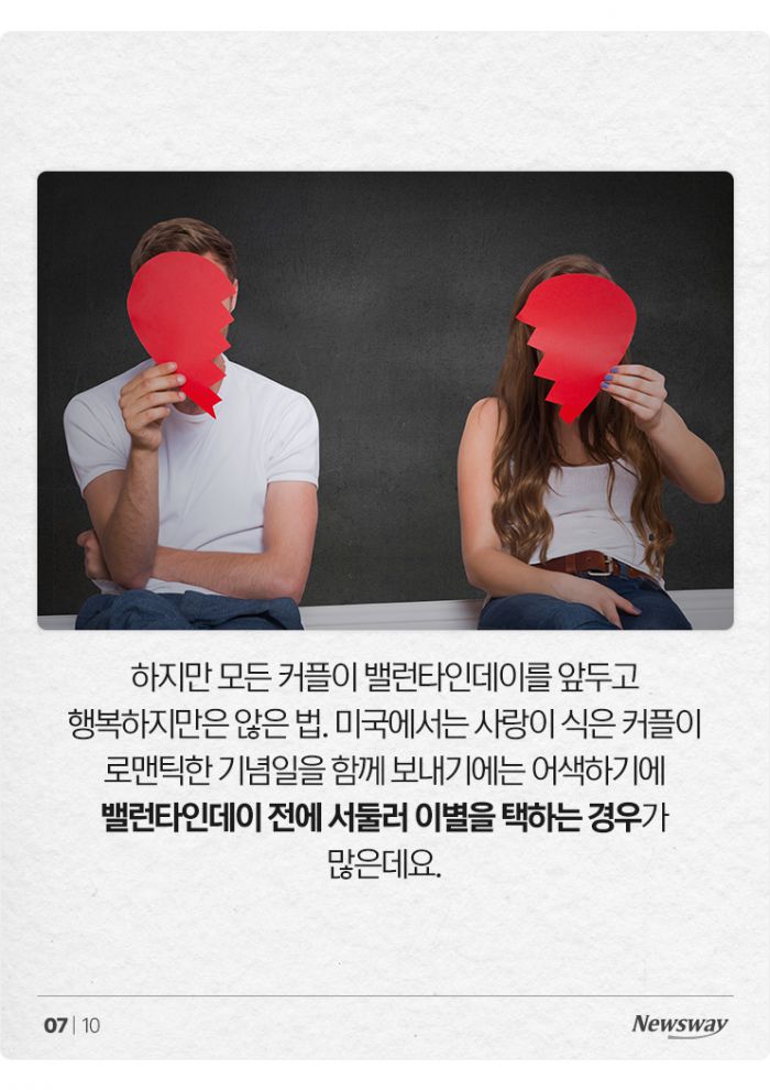 하지만 모든 커플이 밸런타인데이를 앞두고 행복하지만은 않은 법. 미국에서는 사랑이 식은 커플이 로맨틱한 기념일을 함께 보내기에는 어색하기에 밸런타인데이 전에 서둘러 이별을 택하는 경우가 많은데요.