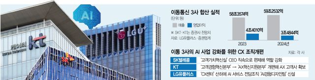 SK텔레콤(017670)·KT(030200)·LG유플러스(032640) 등 이동통신 3사가 전담 조직개편을 통해 인공지능(AI) 서비스 고객 유치전에 돌입했다. 기존 주력사업인 통신사업 부진으로 업계 전반적으로 불황이 심화하는 가운데 서둘러 AI 신사업을 키워 실적 반등을 꾀한다는 게 3사의 공통된 구상이다.