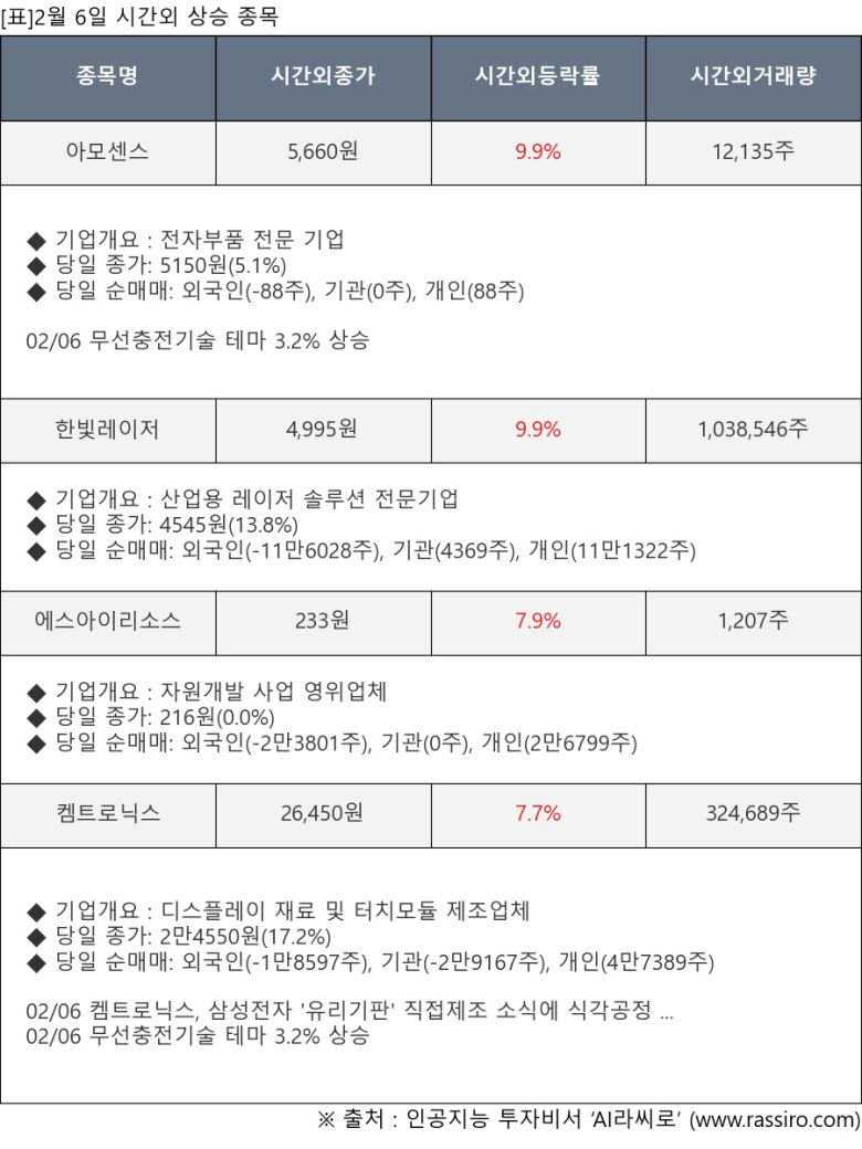 [서울=뉴스핌] 로보뉴스 = 2월 6일, 인공지능 투자비서 ‘AI라씨로’는 시간외 단일가 매매에서 크게 상승한 아모센스(357580), 한빛레이저(452190) 등에 대해 최근 동향을 분석했다.