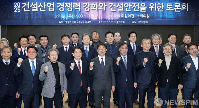 [서울=뉴스핌] 정일구 기자 = 맹성규 국회 국토교통위원회 위원장, 박상우 국토교통부 장관, 한승구 대한건설단체총연합회 회장 등 내빈들이 6일 오후 서울 여의도 국회 의원회관에서 열린 2025 건설산업 경쟁력 강화와 건설안전을 위한 토론회에서 기념촬영을 하고 있다. 2025.02.06 mironj19@newspim.com