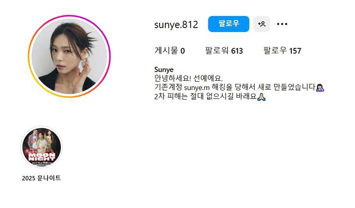 5일 선예는 인스타그램에 "기존의 계정이 해킹당했다. 2차 피해가 생기지 않도록 지인분들 도와주세요"라는 글을 올렸다.