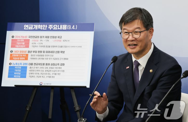 이기일 보건복지부 제1차관이 지난해 9월 13일 서울 종로구 정부서울청사에서 연금개혁 관련 브리핑을 하고 있다. 2024.9.13/뉴스1 ⓒ News1 허경 기자 |