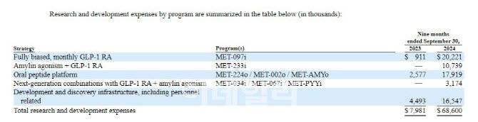 멧세라의 2023년, 2024년 연구개발비 (자료=멧세라가 미국 증권거래위원회(SEC)에 제출한 IPO 증권신고서(S-1/A)) |