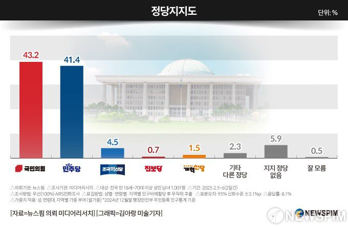 종합뉴스통신사 뉴스핌이 여론조사 전문기관 미디어리서치에 의뢰해 지난 5~6일 전국 만 18세 이상 남녀 1001명을 대상으로 진행한 ARS(자동 응답시스템) 조사해 7일 발표한 결과 국민의힘 지지율은 43.2%로 집계됐다.