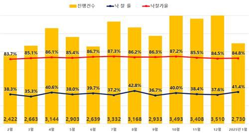 7일 지지옥션이 발표한 '1월 경매동향보고서'에 따르면 지난달 전국 아파트 경매 진행건수는 2천730건으로 전월(3천510건) 대비 22% 감소했으나 낙찰률은 41.4%로 전달(37.6%) 보다 3.8%포인트 상승했다.