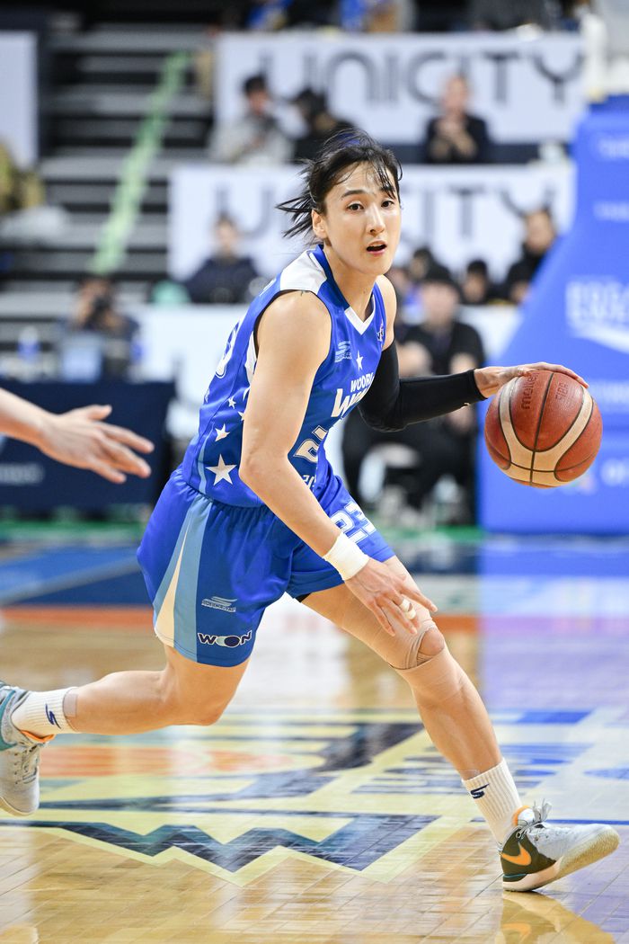 아산 우리은행 김단비가 6일 아산이순신체육관에서 열린 하나은행 2024~2025 여자프로농구 정규리그 BNK 썸과 경기에서 드리블 하고 있다. 사진 | WKBL