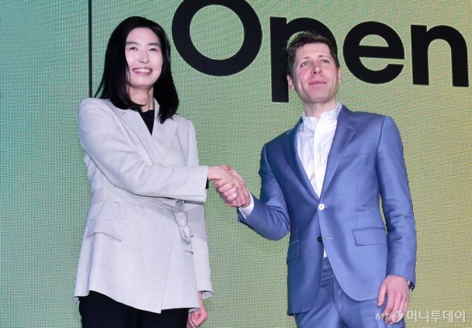 정신아 카카오 대표와 샘 알트만 오픈AI 최고경영자(CEO)가 4일 서울 중구 소공동 더 플라자 호텔에서 진행된 카카오 미디어 데이(KaKao Media Day)에 참석, 인사를 나누며 기념촬영을 갖고 있다. /사진=머니S