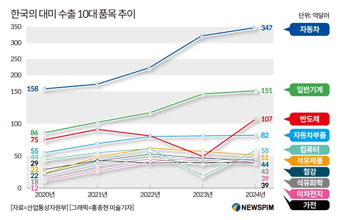 반면 반도체는 대미 시장 3위로 올라서며 선전하고 있다. 지난해 107억달러를 고전했던 2023년(49억달러) 대비 두 배 이상 성장했다. 트럼프의 중국 견제로 인해 기회가 생길 수도 있지만, 중국을 경유하는 미국 수출은 타격이 우려되는 상황이다.