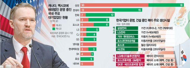 그리어 지명자가 미국·멕시코·캐나다협정(USMCA)에 제3국이 무임승차하지 못하게 하겠다고 재차 밝히면서 멕시코·캐나다에 진출한 우리 기업의 불확실성이 더해졌다는 진단이 나온다. 중국 기업들이 멕시코에 공장을 건설, 우회적으로 미국 시장에 진출하는 것을 막겠다는 게 1차적인 목적이지만 USMCA에 기대 멕시코에 공장을 지었던 한국 기업들도 피해가 불가피할 것으로 전망된다. 기업분석 전문 업체 한국CXO연구소가 공정거래위원회 지정 88개 대기업집단이 캐나다·멕시코에 세운 해외법인을 조사한 결과 25개 그룹이 해외계열사 201곳을 설립한 것으로 나타났다. 캐나다에 100곳, 멕시코에 91곳이 있다.
