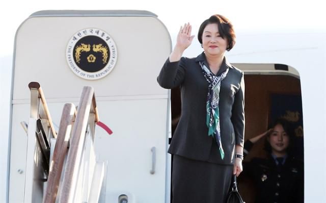 First Lady Kim Jung-sook waves upon arrival at Seoul Air Base in Seongnam for her visit to India in this file photo taken on Nov. 4, 2018. Yonhap |