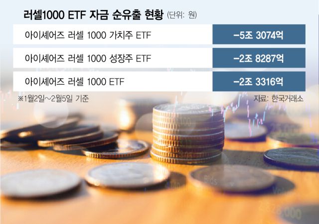 7일 한국거래소에 따르면 올 들어 전날까지 미국 중소형주들이 주로 편입돼 있는 러셀 2000 지수 내 상위 1000개 가치주를 선별해 투자하는 ‘아이셰어즈 러셀 1000 가치주(IWD)'에서는 36억 6628만 달러(약 5조 3074억 원)의 자금 순유출이 발생했다. 같은 기간 ‘아이셰어즈 러셀 1000 성장주(IWF)’와 ‘아이셰어즈 러셀 1000(IWB)’에서도 각각 19억 5430만 달러(약 2조 8287억 원)와 16억 1070만 달러(약 2조 3316억 원)의 자금 이탈이 발생했다.
