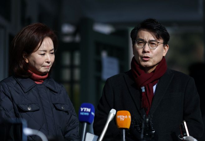 국민의힘 윤상현·김민전 의원이 7일 경기도 의왕시 서울구치소에서 윤석열 대통령과의 면회를 마친 후 관련 인터뷰를 하고 있다. /연합
