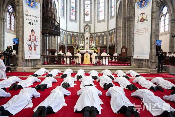 [서울=뉴시스] 사진공동취재단 = 천주교 서울대교구가 서울 중구 명동대성당에서 사제 서품식을 거행한 7일 사제 서품 예정자들이 기도하고 있다. 부제 26명이 이날 성품성사를 받고 사제 품계를 받았다. 2025.02.07. photo@newsis.com |