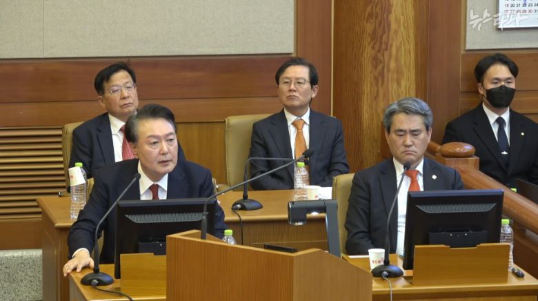 △ 지난 6일 윤석열 대통령 탄핵심판 6차 변론 기일에 참석한 윤 대통령과 변호인단.