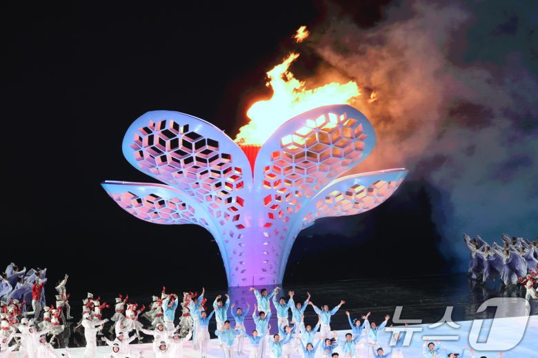 (하얼빈=뉴스1) 이상철 문대현 안영준 기자 = '얼음 도시' 중국 하얼빈에서 28m 대형 성화가 피어오르며 동계아시안게임 개막을 알렸다. 개회식은 실내에서 진행됐지만 성화는 하얼빈의 또 다른 상징인 빙등제 현장에서 점화했다. 중국 스피드스케이팅 금메달리스트 장훙이 최종 점화자로 불을 붙였다.