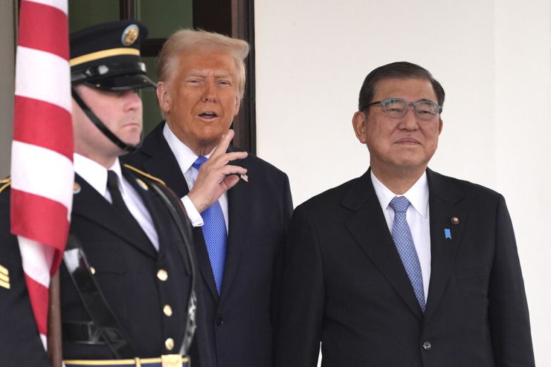 도널드 트럼프 미국 대통령이 7일 백악관에서 이시바 시게루 일본 총리 (오른쪽)를 맞이하고 있다. 워싱턴/AP 연합뉴스 |