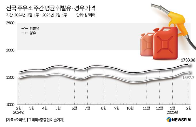 8일 한국석유공사 유가정보서비스 오피넷에 따르면 이번 주(2월 1주) 주유소 휘발유 판매가격은 전주 대비 0.04원 하락한 리터당 1733.06원, 경유 판매가격은 1.1원 상승한 리터당 1597.7원으로 나타났다.