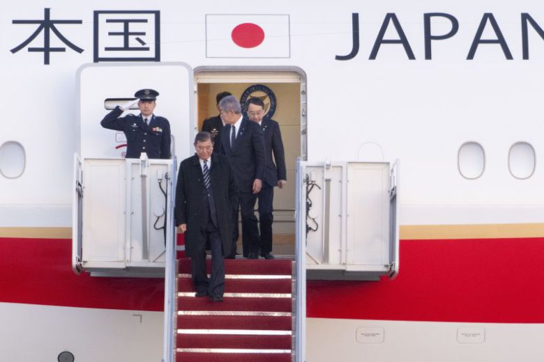 이시바 시게루 일본 총리가 6일(현지시간) 미일 정상회담을 위해 미국 앤드루 공군기지에 전용기 편으로 도착해 내리고 있다. AP 뉴시스 |