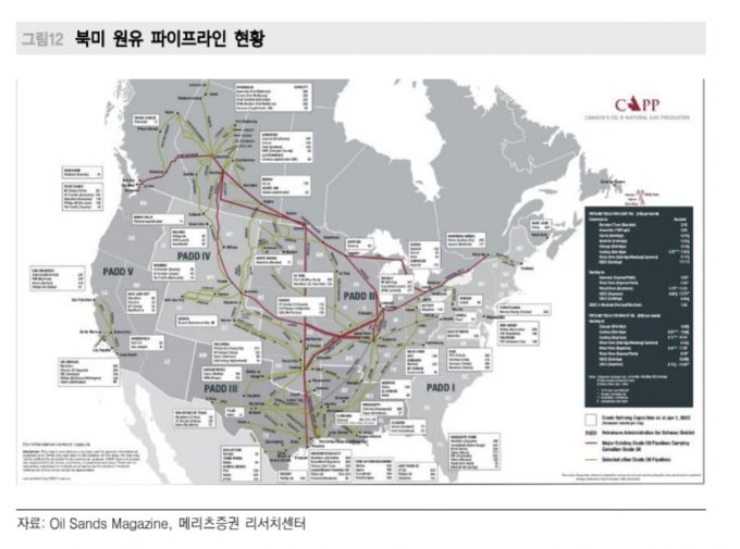 캐나다 역시 지난해 로키산맥을 횡단하는 TMX(트랜스 마운틴 송유관 프로젝트)를 확장(하루 30만 배럴→89만 배럴)하며 미국 외 지역으로 수출 여력을 강화했다. 윤재성 하나증권 연구원은 "지난해 5월 TMX 완공 이후 캐나다의 해상 원유 수출량이 65% 증가했다"며 "아시아 기업들의 원가 수혜 가능성이 농후하다"고 설명했다. 노우호 메리츠증권 연구원은 "중동 두바이 원유와 품질이 유사한 캐나다산 원유의 아시아향 수출이 증가하면, 국내 정유사들의 도입원가가 절감될 수 있다"고 말했다.